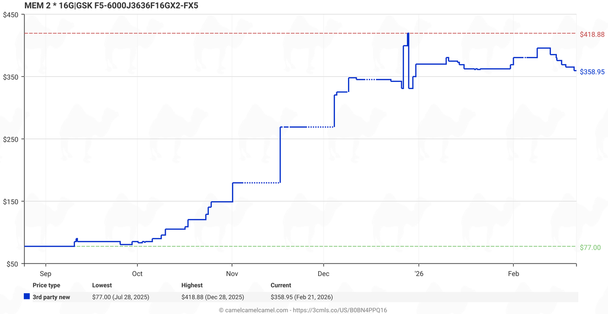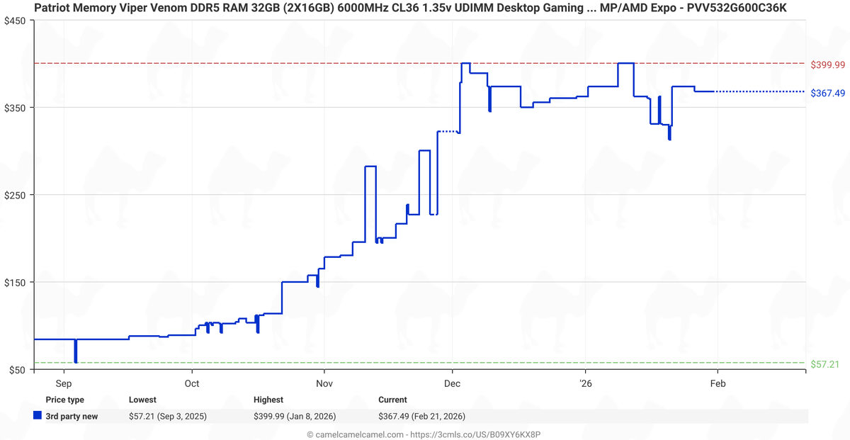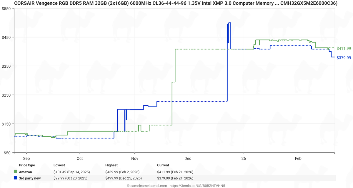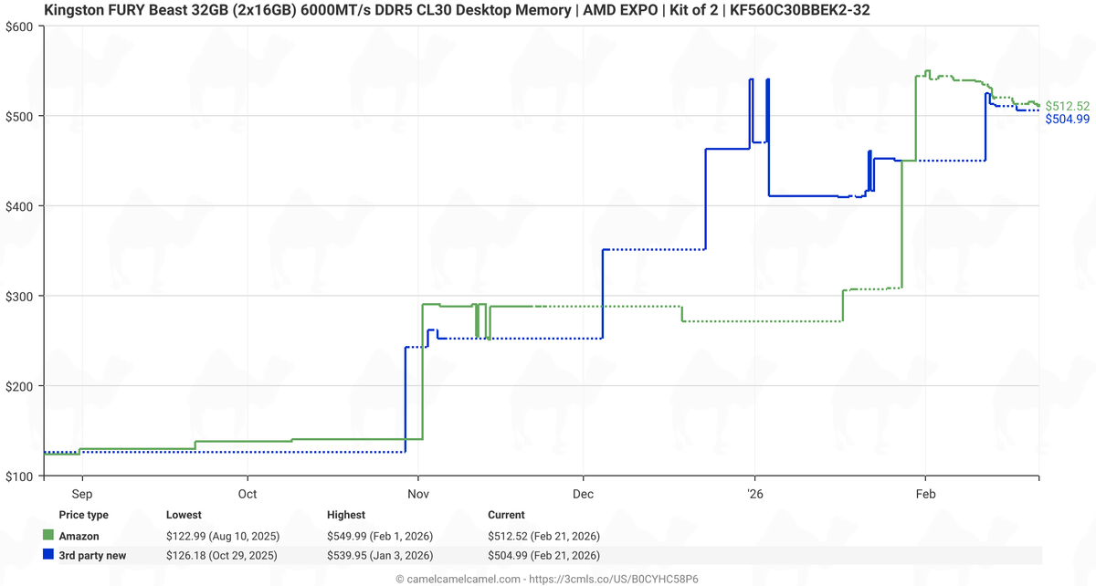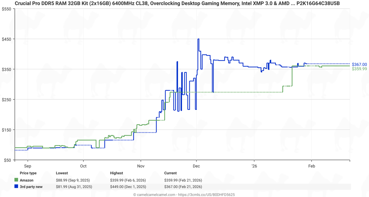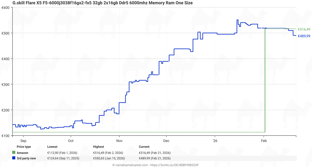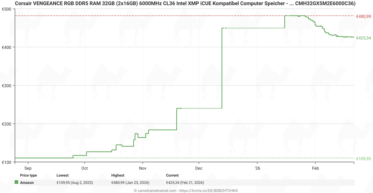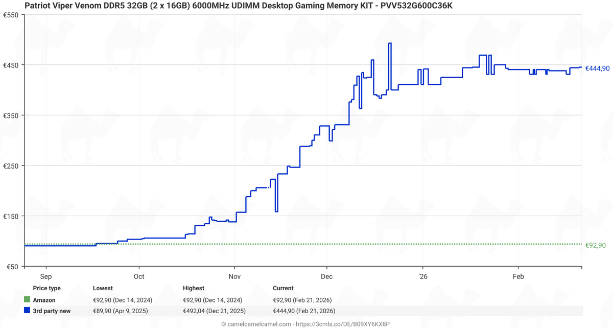 While the graph from deserves attention, it lacks clarity and details (which kits, which countries, retailers, is VAT included, etc.), so we decided to do our own price trend checks of five popular 32 GB DDR5-6000/6400 dual-channel kits* from renowned brands like Crucial, Corsair, G.Skill, Kingston, and Patriot in Amazon Germany using the CamelCamelCamel service.