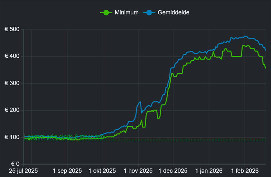 The chart allegedly depicts aggregated pricing of an ‘average’ 32 GB DDR5 kit across the European Union from late July 2025 to February 2026. Prices hovered around €95 (minimum, green) – €100 (average, blue) through early autumn, then began climbing sharply in October, accelerating through November and peaking in early February at roughly €430 – €470 on average, with minimum prices slightly lower. Toward the end of the period, both lines trend downward, which may either indicate a modest correction after the spike or an actual drop in prices due to certain factors.